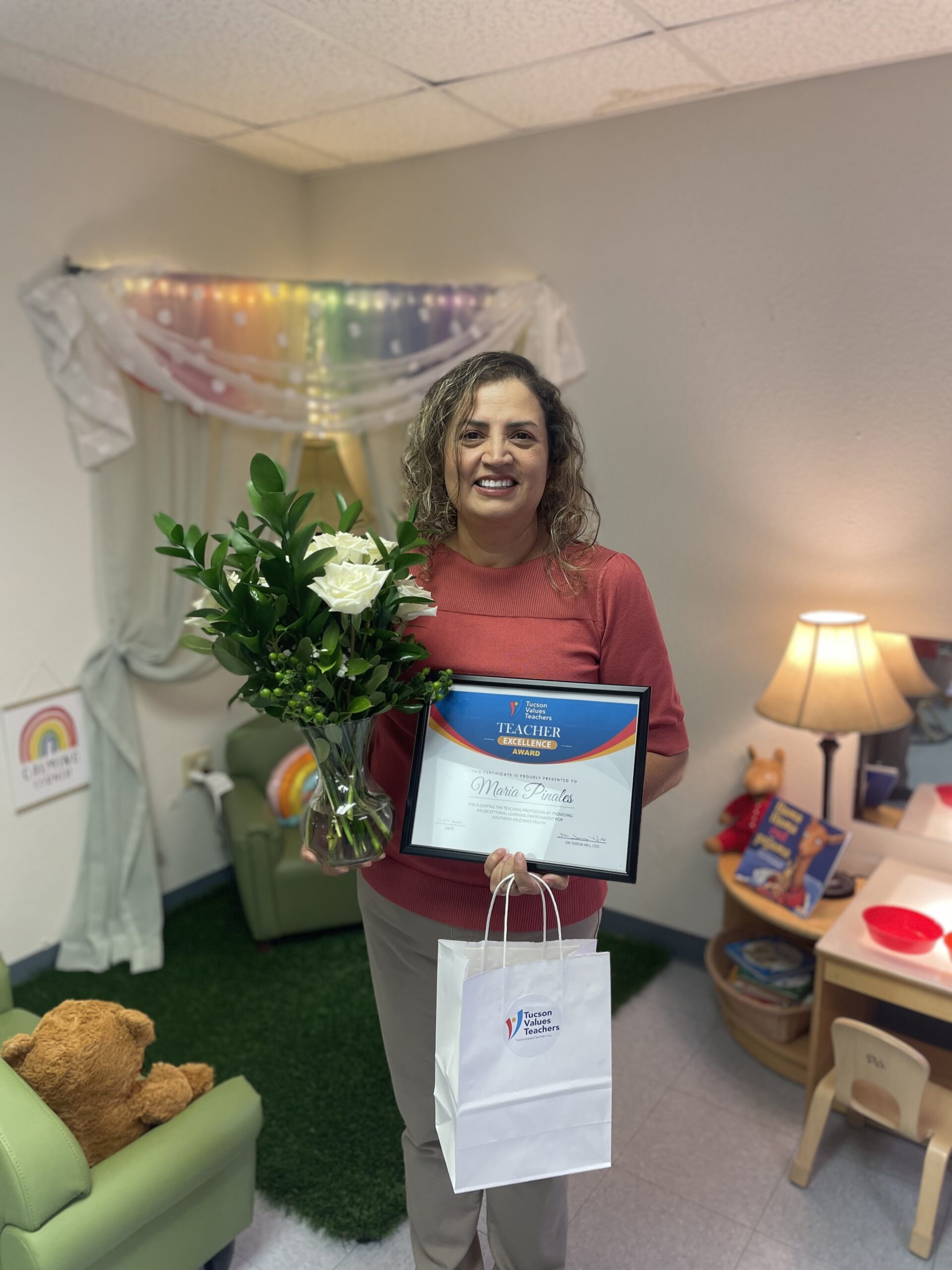 Mrs. Pinales collaborates with her co-workers and is able to implement her ideas as well as her co-workers. Their classroom runs like a smooth machine as if the children have been there for years. Mrs. Pinales encourages a lot of music in her classroom. She sings with her students with a ukulele. When you walk into her classroom and hear that song, you feel the invitation of also joining in and singing with everyone. Mrs. Pinales is very patient with her students and is open to try new and other ideas that might also encourage her students to learn.